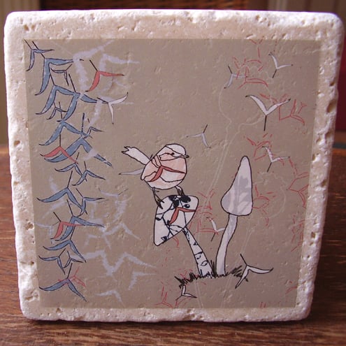 A set of four natural stone coasters each decorated with an original litllebirdy design.