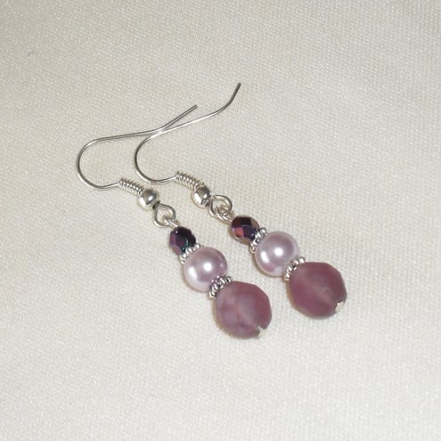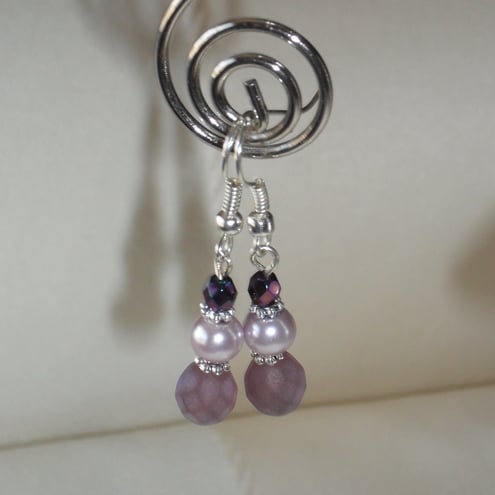 I've made these earrings using contrasting textures - sparkling crystal, faux pearl and fire-polished crystal. Two of the beads are purple, the third is cream, and they are separated by silver coloured spacers and hung on silver-plated wires.