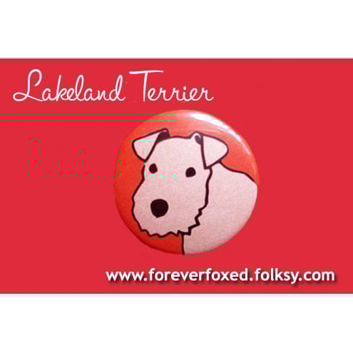 Cute Lakeland Terrier on a lovely shiny badge / button with a metal pin back.