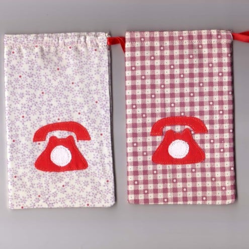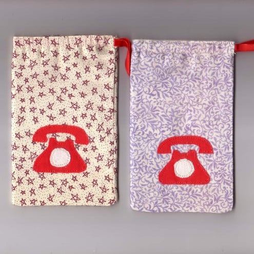 A delightful little case to protect your mobile phone, with a twist of tradition, with appliqued red telephone.. It is lined in a soft brushed cotton, with a drawstring ribbon to close it.