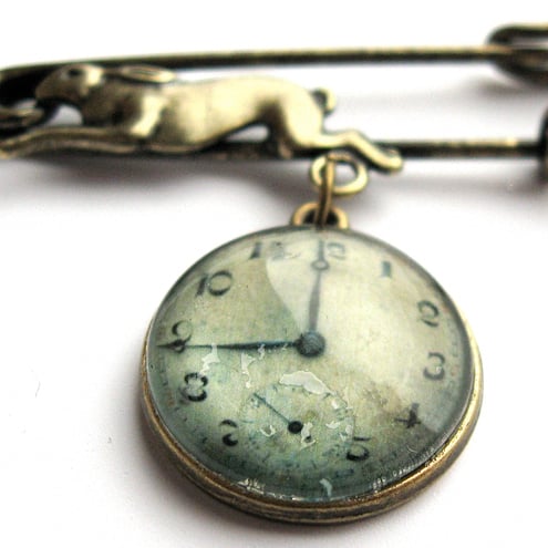 This is a gorgeous brooch featuring a brass hare and a clock face taken from a photograph of a Victorian timepiece.
