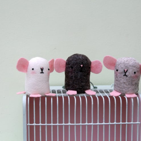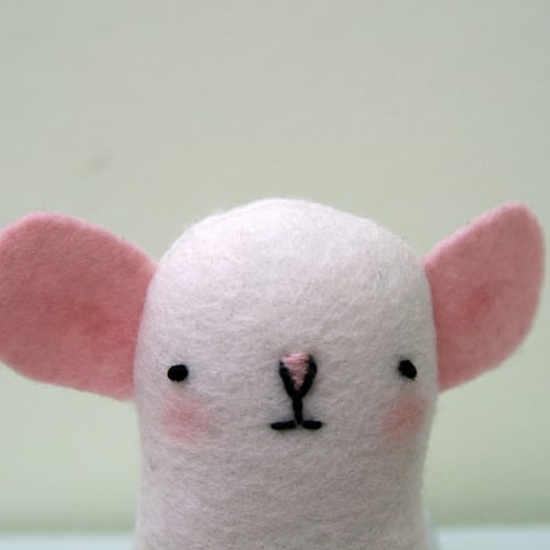 Here is the cutest baby mouse in need of care, please give him a loving home! Hand made by me out of cream wool felt ,soft stuffing and weighted with pellets(enclosed safely) perfect size for sitting in your hand. His cute face is Hand embroidered.He measures 2 1/4" high. His friends are available in other listings.