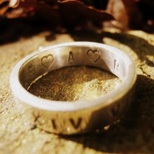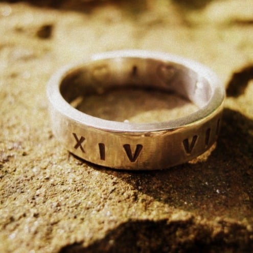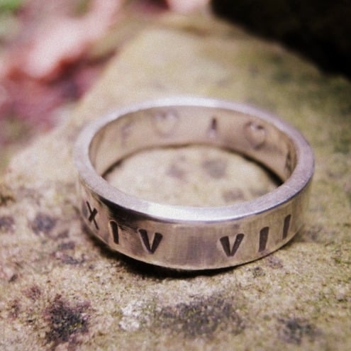 Your sterling silver ring is hand stamped, letter-by-letter with your chosen date (In Roman numerals or standard numerals - your choice) on the outside, and your message on the inside. A great piece for celebrating that special moment in your life.