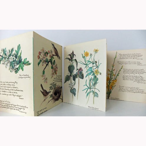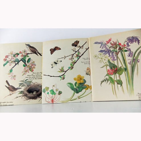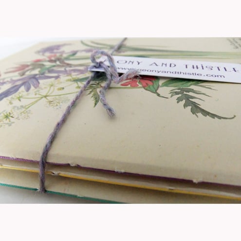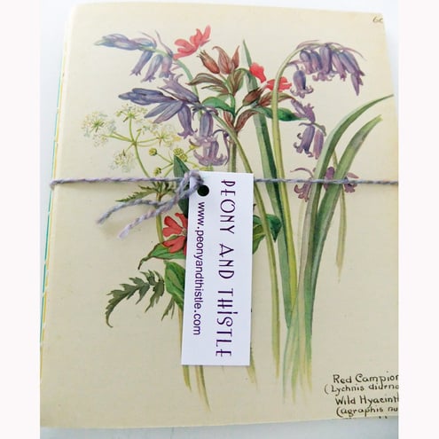The covers of these notebooks are pages of a discarded copy of the lovely book, The Country Diary of an Edwardian Lady by Edith Holden. In 1906, Edith Holden recorded in words and paintings the flora and fauna of the British countryside through the seasons. These notebooks’ covers show some of these gorgeous paintings and words.