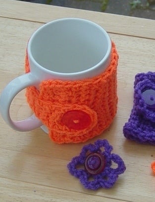 This Mug cosy is for the average sized mug and crocheted in a continuous lines, and then the contrasting little floral brooch as an added gift.