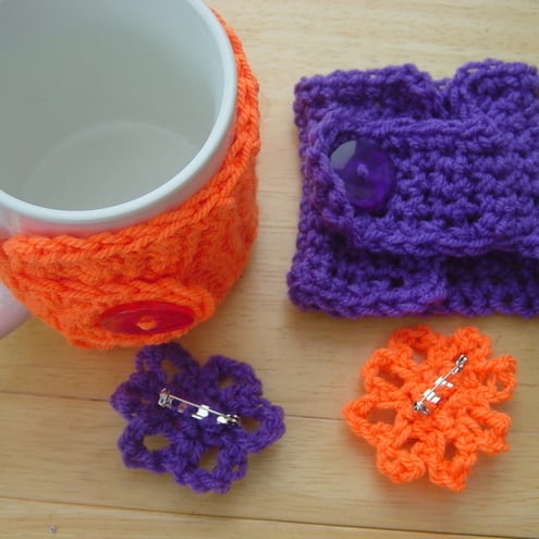 Orange Passion Mug Cosy, or Mug Hug, with contrasting floral brooch, crocheted in 100% acrylic yarn.