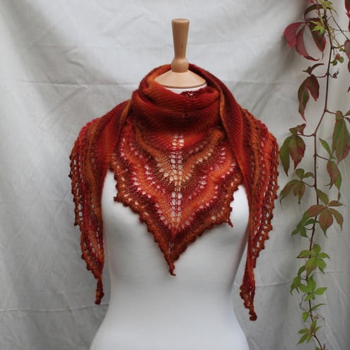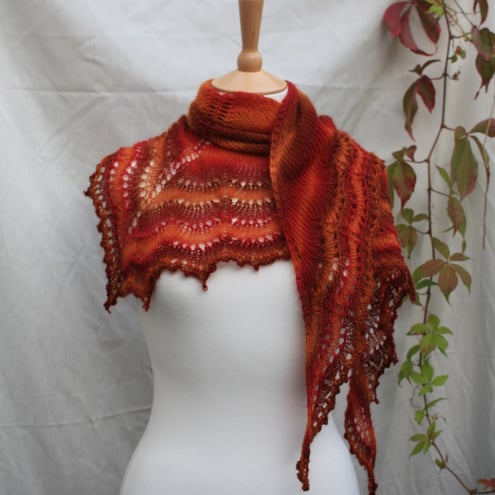 Knitted in a stockingette and lace frill design with a slight swallowtail edge, and finished with a picot cast off that you think will never end! Can be worn as a shawl because of the length.