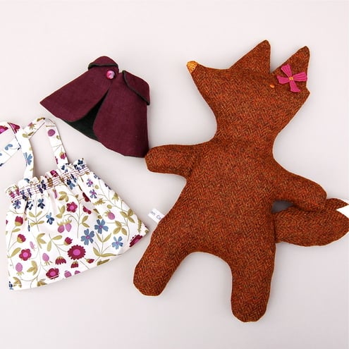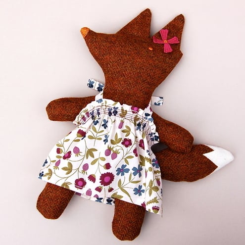 Wool tweed fox with polyester safety filling, hand embroidered face and hand woven flower.