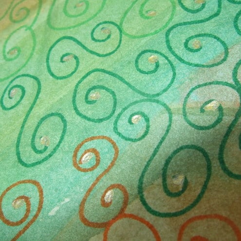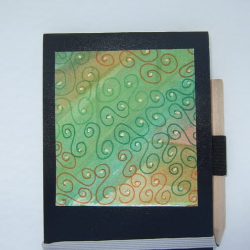 I painted the background with green and orange watercolours first then drew green and orange scrolls, which have then been finished off with a gold dot, making a very stylish decoration for these notebooks taking it from the ordinary into a one of a kind item.
