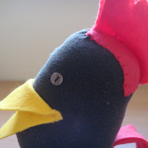 Go cock-a-hoop for this rooster! Made from a cotton sock, felt and buttons, handsewn and filled with hollowfibre filling (which complies with the furniture and furnishings (fire safety) regulations 1988). Measures approx. 9 inches/24 cms in height.