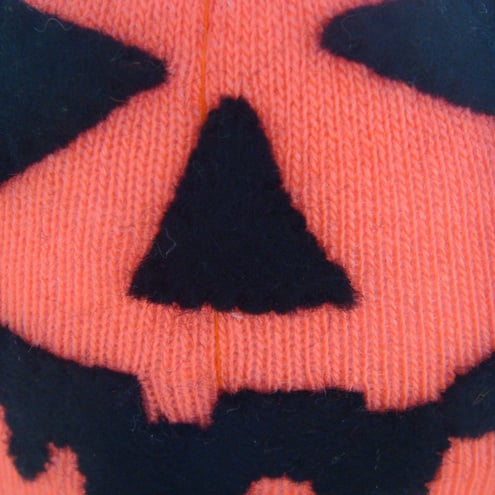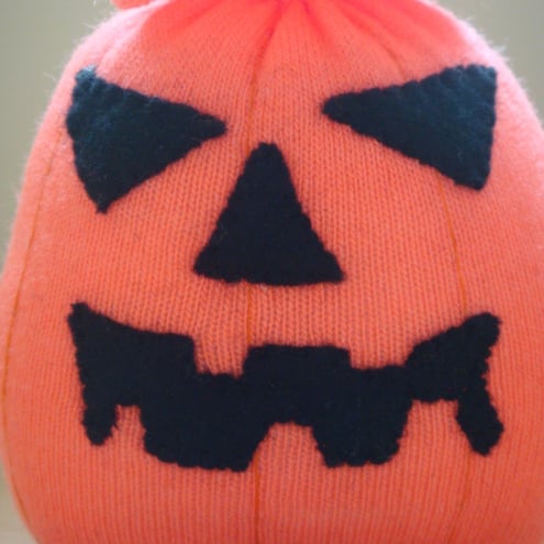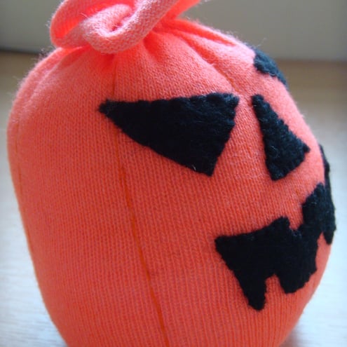 Made from a fluorescent orange sock and black felt, handsewn and filled with hollowfibre filling (which complies with the furniture and furnishings (fire safety) regulations 1988). Measures approx. 4 inches/10 cms in height.