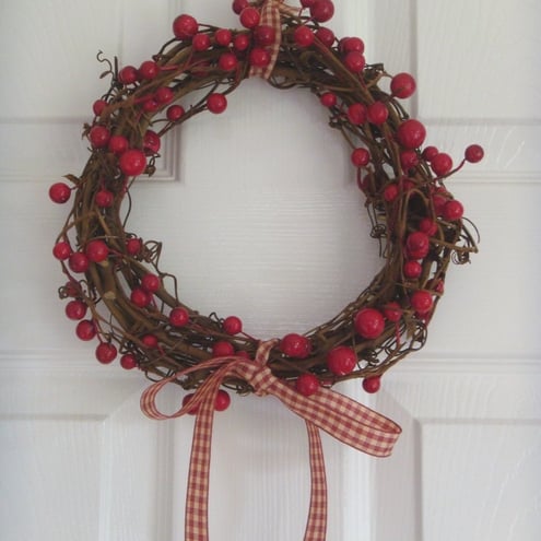 Offer a festive welcome with this simple twig wreath, embellished with artificial red berries and gingham ribbon.
