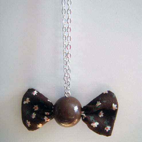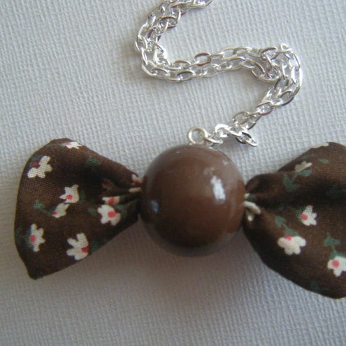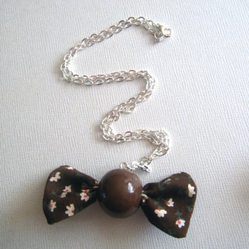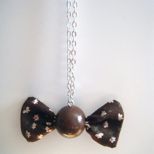 This scrummy yummy floral fancy Kimbows sweetie bow necklace is made using a brown and red floral printed cotton fabric with a choccy brown glossy painted wooden beads