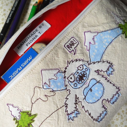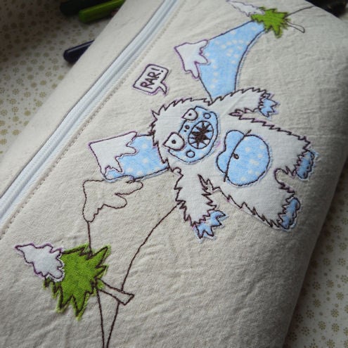this generously sized pencil case features a white and pale blue cotton yeti, and snowcapped pale blue mountains & green trees – which are appliqued and free motion embroidered.