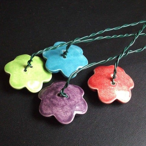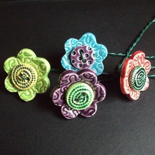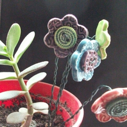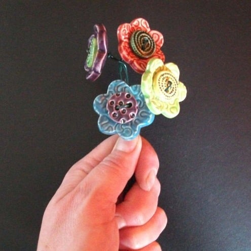 These cute and unique little flowers are made up from two ceramic buttons thread onto plastic coated florests wire.