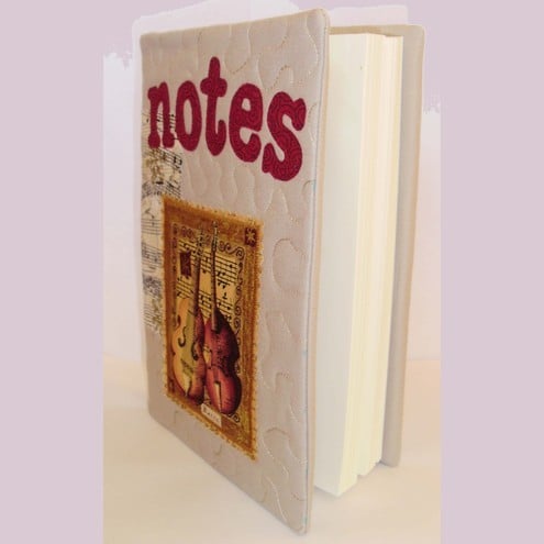 A5 note book. The cover is made from a cream woven fabric, which has the word "notes" , and musical panels appliqued on.. Complete with standard A5 plain paper notebook, refills are easily available,