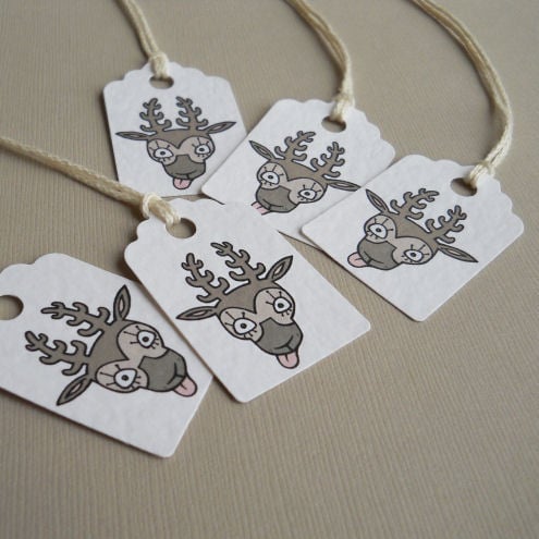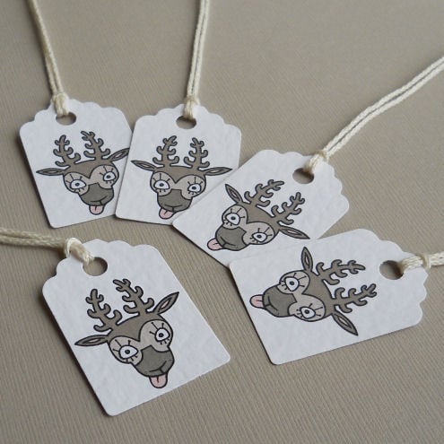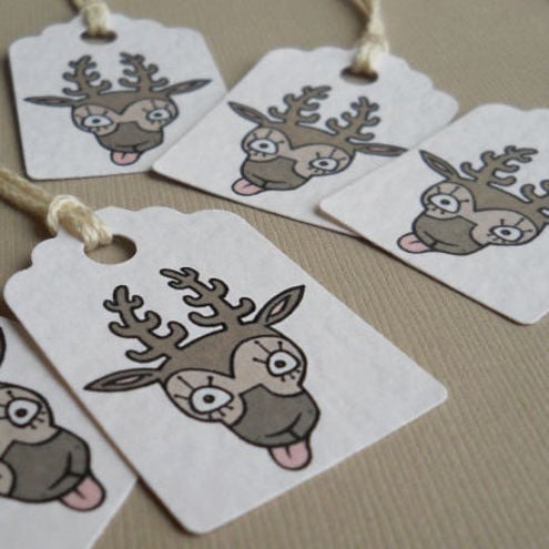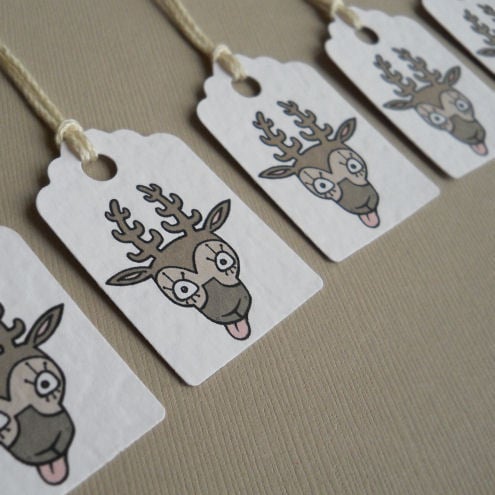 a pack of 5 tags, featuring my original illustration of a cheeky reindeer! cute and quirky, and great to use on your gifts this christmas.