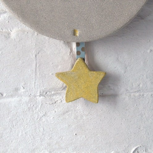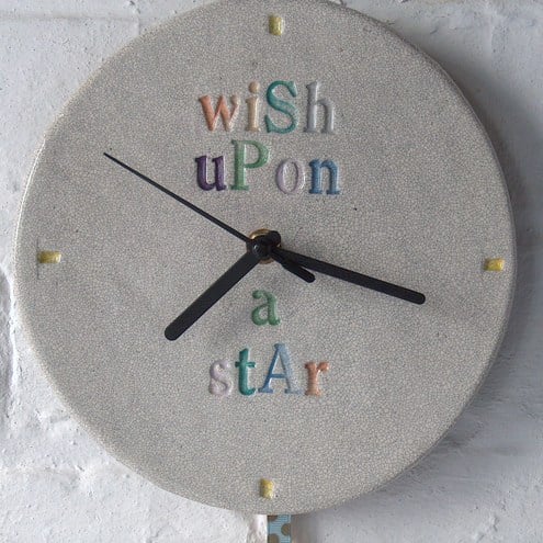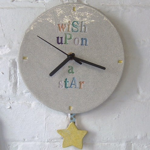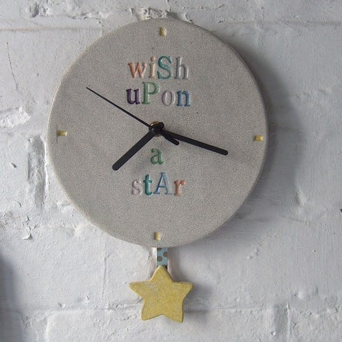 A pretty pendulum clock, made with quartz mechanism. The ceramic clock face is finished in a crackle glaze and decorated with the text 'Wish Upon a Star', in coloured underglazes. The pendulum is a little star finished in a yellow underglaze, which swings from side to side, and is attached with a wooden arm covered in pretty ribbon.
