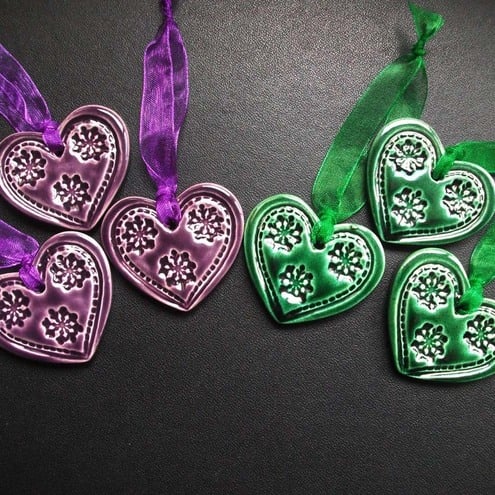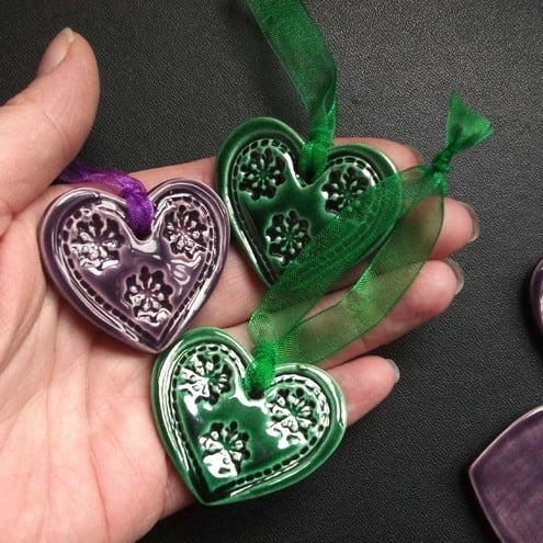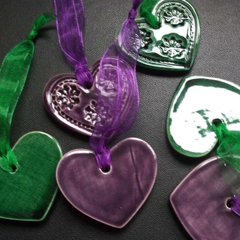 These brightly jewel coloured hearts are made from white earthenware clay - stamped with an image and glazed in bright glossy colours.