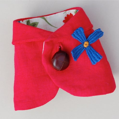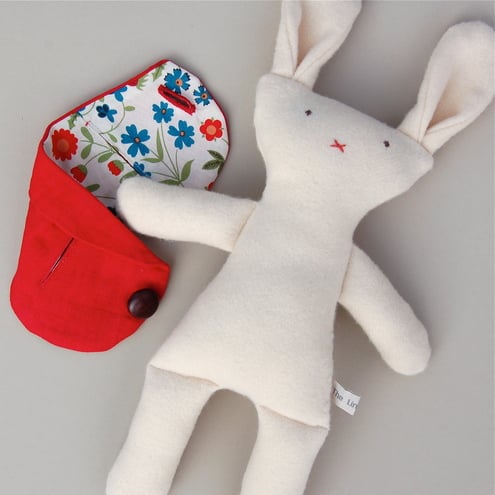 Cuddly cream cashmere and wool blend bunny with embroidered face and polyester stuffing. Red linen removable waistcoat with floral cotton lining, leather button and hand woven flower.
