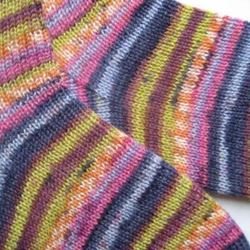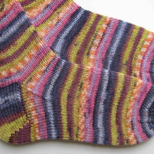 I made this pair from Drops Fabel self patterning sock yarn, 75% wool 25% polyamide. The stripes are vibrant shades of pink, purple, green, orange and cream, with bands of random patterns. Warm and durable, these socks will keep your feet cosy and bright throughout the year.