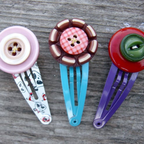 3 x hair clips made with a mix of new and vintage buttons in a bright colour combination and attached with silver and gold thread and glue.Approx 5 cm. long.Packaged in a gift bag with retro comic image.