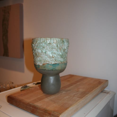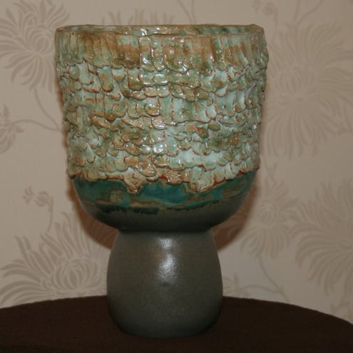 CUSTOMER ORDER DO NOT BUY Stoneware hand made coiled pot with highly textured top section, finished in green glaze & white/green glaze on textured inner & outer areas.