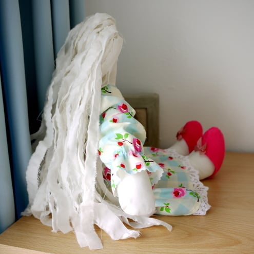 The PDF shows you how to cut out your fabric using the full size templates. How to sew and stuff the doll and create her raggy hair (the most fun part!) Full instructions are included for making her pretty dress with optional lace hem, gathered sleeves and lined bodice. You will also learn how to make her a matching bag and shoes from felt scraps and ribbons.