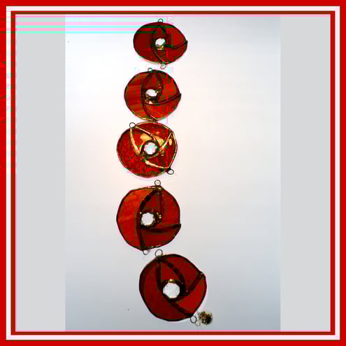 It comprises five little bright red Makintosh roses each with a shiny red nugget in the centre.