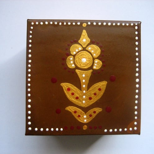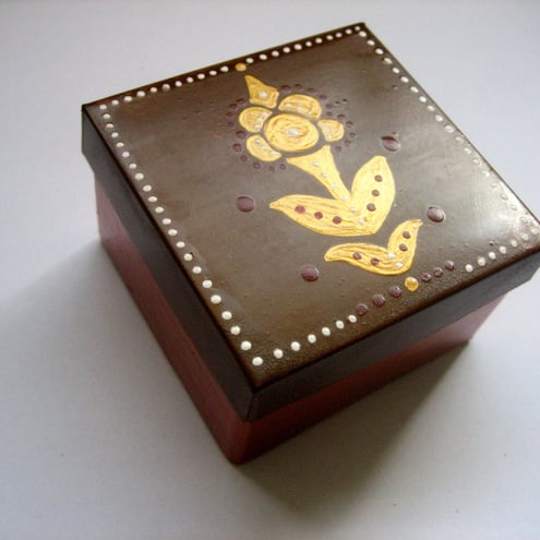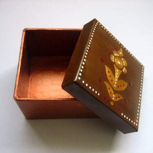 This is a hand painted copper papier mache trinket box with a metal lid. I used acrylic paint then varnished it for protection.