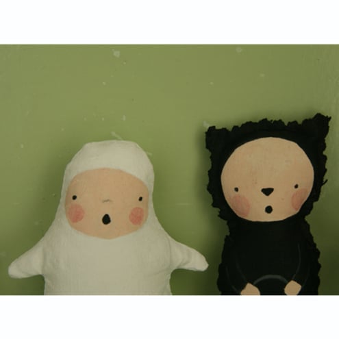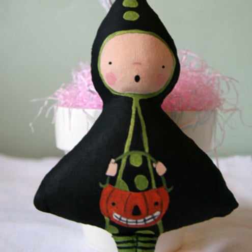 Here we have four small dolls for decoration. They are made by hand from calico and painted with acrylic paints. They are all dressed up or Halloween. They would also be cute for non holiday purpose. They measure between 8cm and 14cm.