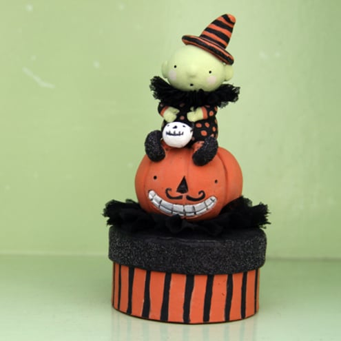 Here we have a very cute little witch who is getting ready for Halloween she is sat atop a jolly pumpkin which is attached to a little box, this does open but is meant more as a base for the sculpture. Hand made one of a kind sculpture made from air dry clay, acrylic paint ,glitter and fabric.measures 10cm tall approx.
