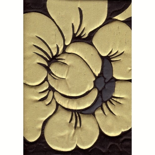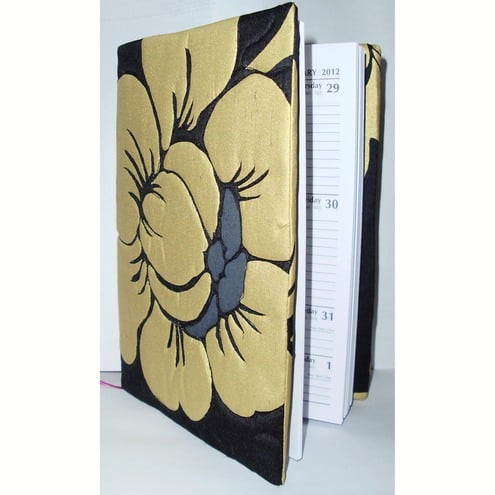 A5 fabric covered diary. The cover is made from a black and gold patterned fabric, which has been quilted to enhance the effect.