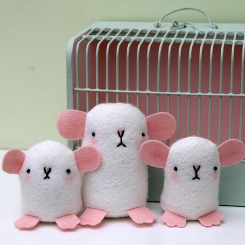Here we have mama mouse and her two babies one who obviously has been getting most of the food! They are made by hand from lovely wool felt ,they are stuffed with high quality stuffing and also pellets(sealed in bag for safety) to weight them a bit. Their little faces are hand embroidered so they all look a little different. Perfect size for putting in your pocket or holding in your hand. Help mama mouse with her mischievous mouslings. Cage not included.
