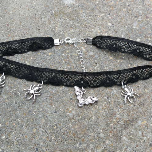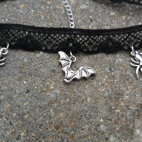 Black lace choker with 5 charms, one bat in the centre with 2 spidrs either side bat measures 25mm x 15mm, and spiders 18mm.