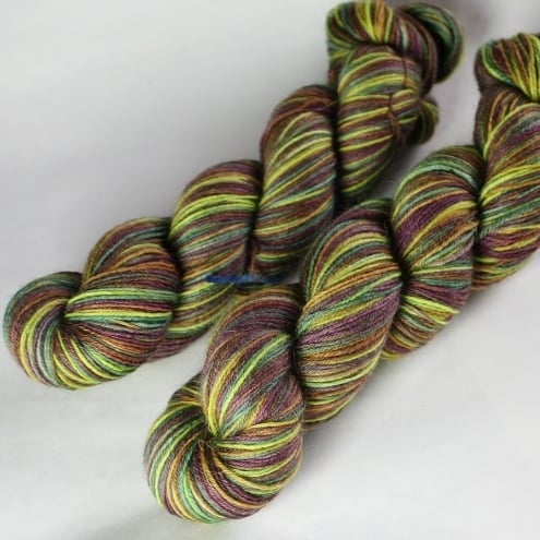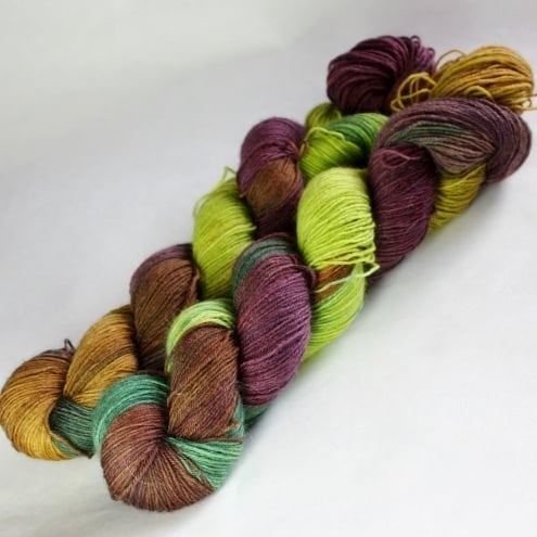 Woody yellow-green, bronze, brown, green and aubergine. This British Bluefaced Leicester superwash yarn is soft with a very slight lustre. The yarn has been reskeined as shown in the first two photographs, but is shown in the third photo before reskeining for reference only. There is one skein left.