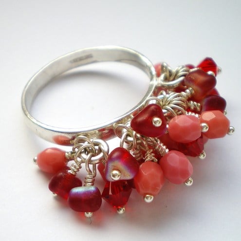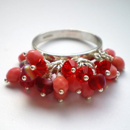 A sterling silver ring with clusters of red swarovski crystal, pink fire polish glass and irredescent red sea glass. Absolutely gorgeous and light to wear! Really catches the sunlight.