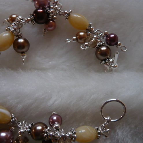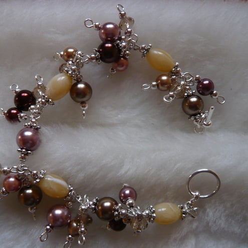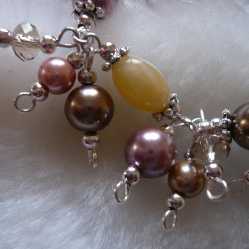 There are different shades of brown faux pearls with alternate cream acrylic beads. On each link there are 3 beads attached.