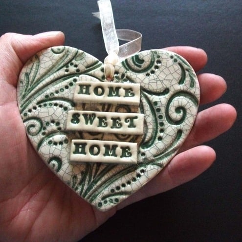 This ceramic heart is made from white earthenware clay and decorated with the words "Home sweet home" It has a green swirly background finished off with a crackle glaze for a shabby chic look.