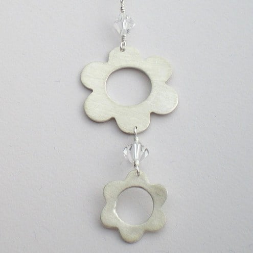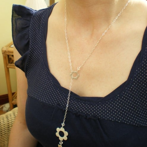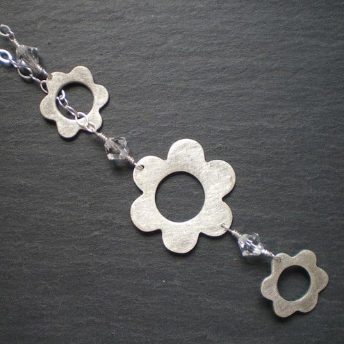 Lovely long lariat with 3 sterling silver daisies and swarovski crystals. A really elegant eye catching style. Suspended on a sterling silver link chain. Total length is 32 centimetres. Can be worn as a choker or looser as preferred.
