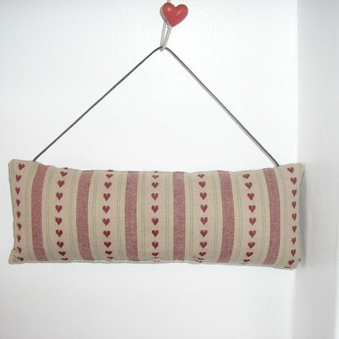 The cushion is made from dark beige and rusty red fabric with stripes and hearts.