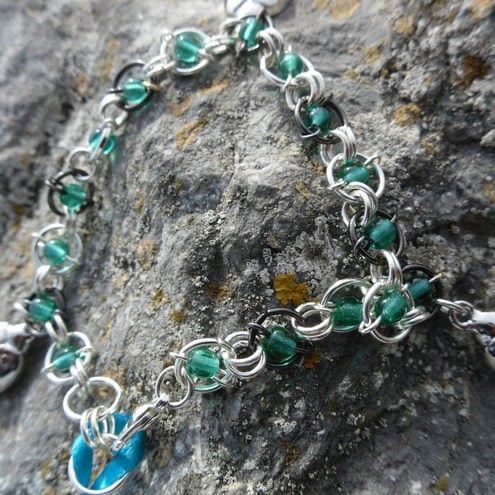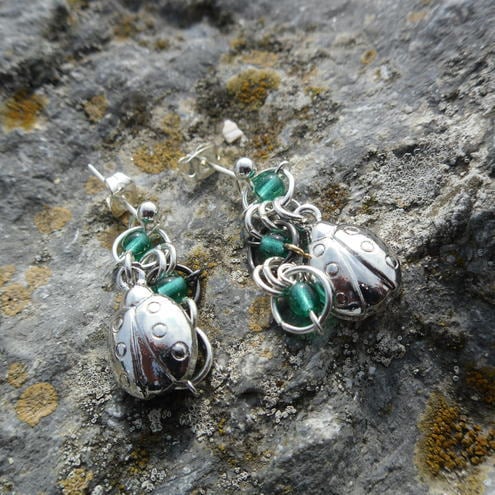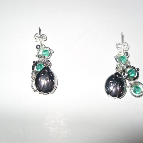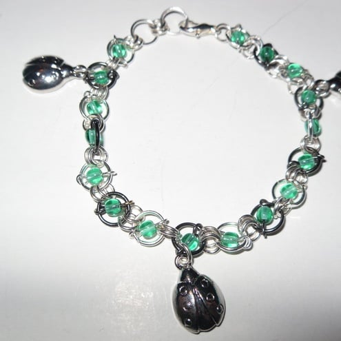 Silver plated Bracelet with hand made chain and three silver plated ladybird charms, With Green beads. size adjustable.