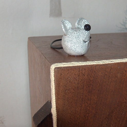 The little mouse is sitting on top of the clock, waiting for the clock to strike one, the face is a ceramic disc finished in a crackle glaze and an emphasised number one.