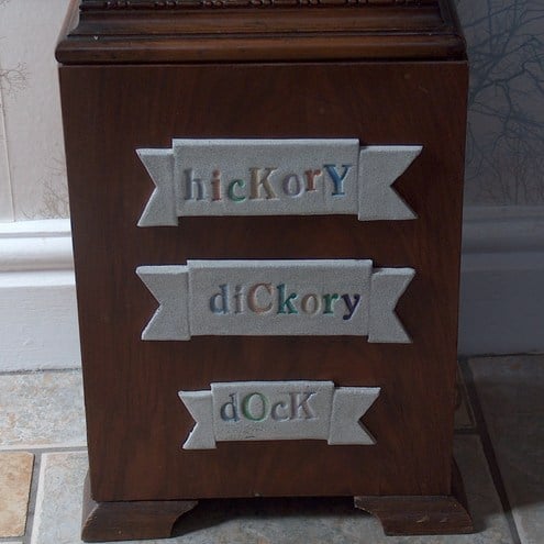 The clock is a beautiful piece on it's own, and I've decorated it on the theme of the nursery rhyme, Hickory Dickory Dock.