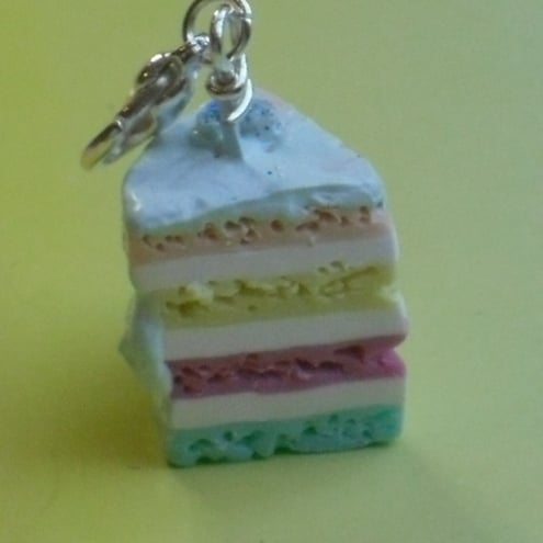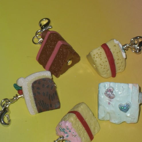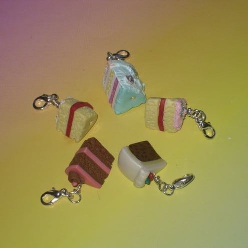 5 cute cake charms as shown with lobster clasp to fix to item of your choice. Hand made myself from polymer clay.