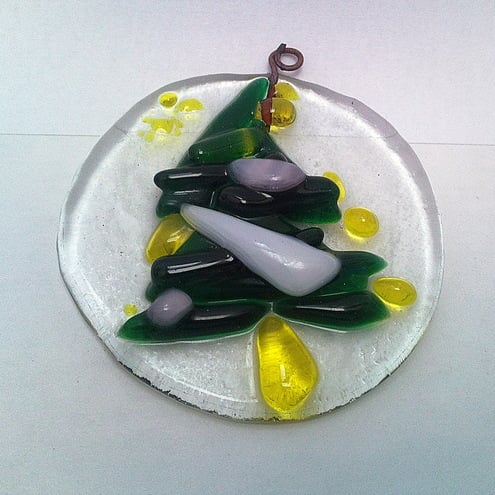 Made entirely from recycled glass, pieced together and melted in my kiln. This little green tree with yellow and white trim will look great hanging from the tree or in a window and is a perfect little stocking filler.