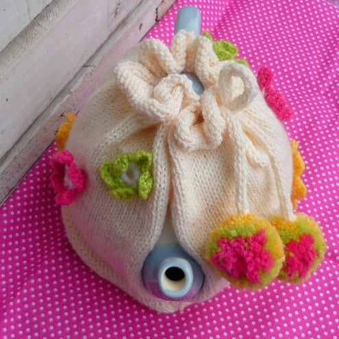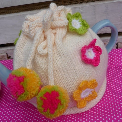 Here we have a hand knitted tea cosy with crochet flowers and pom poms.