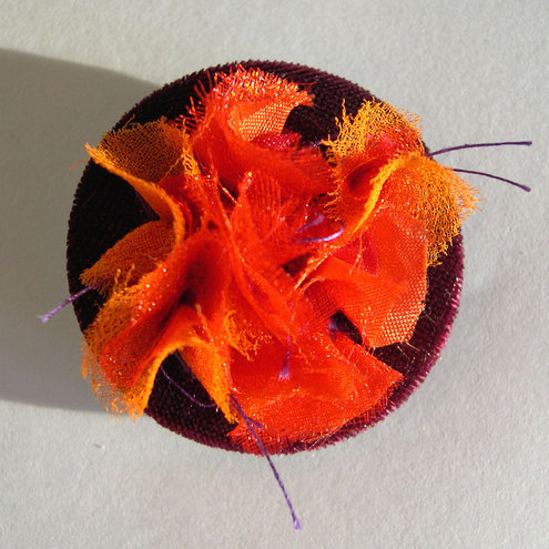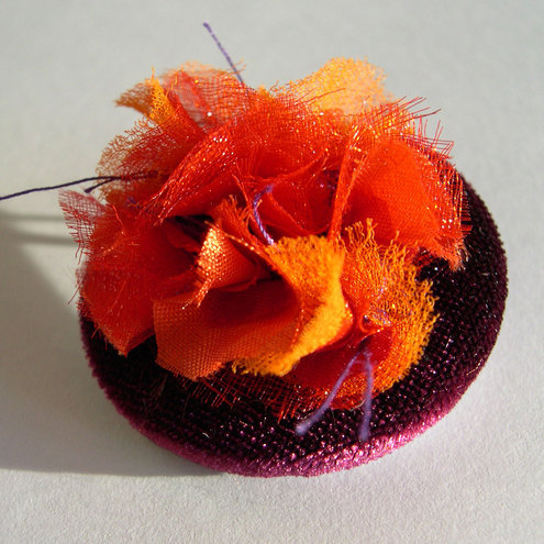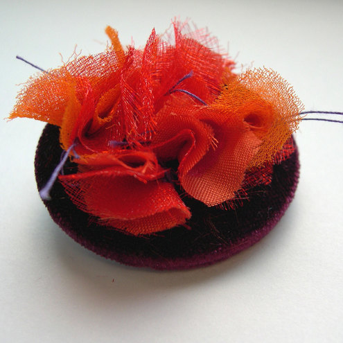 This pin is created with a sumptuous plum coloured velvet and the mini flowers are mandarin with flame red voiles and hand stiched with a contrasting violet coloured thread.