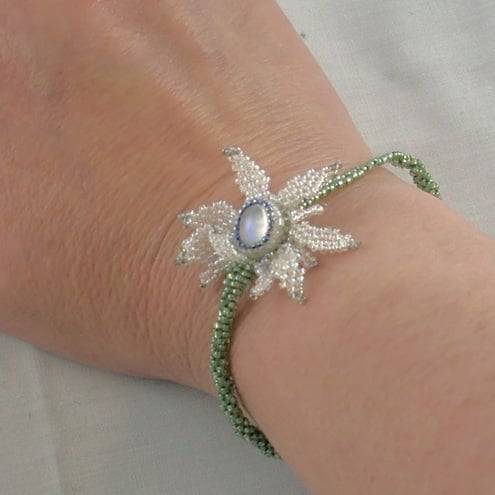 Pretty, delicate bracelet, with a beaded daisy flower created around a little rainbow moonstone cabochon. The petals are created with brick stitch needle weaving with tiny seed beads.