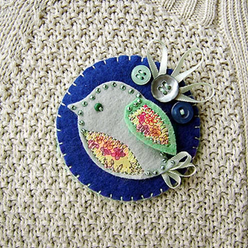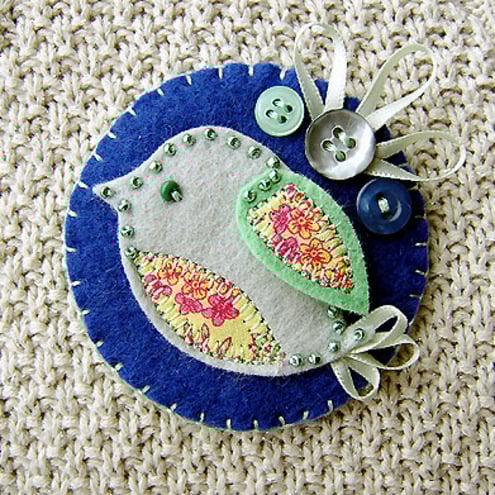 This is a lovely handmade fabric brooch. It features a little felt bird with appliqued wing and belly edged with pretty green beads. It is mounted onto blue felt and is finished with three buttons and a ribbon detail. It has a brooch backing for easy attachment.